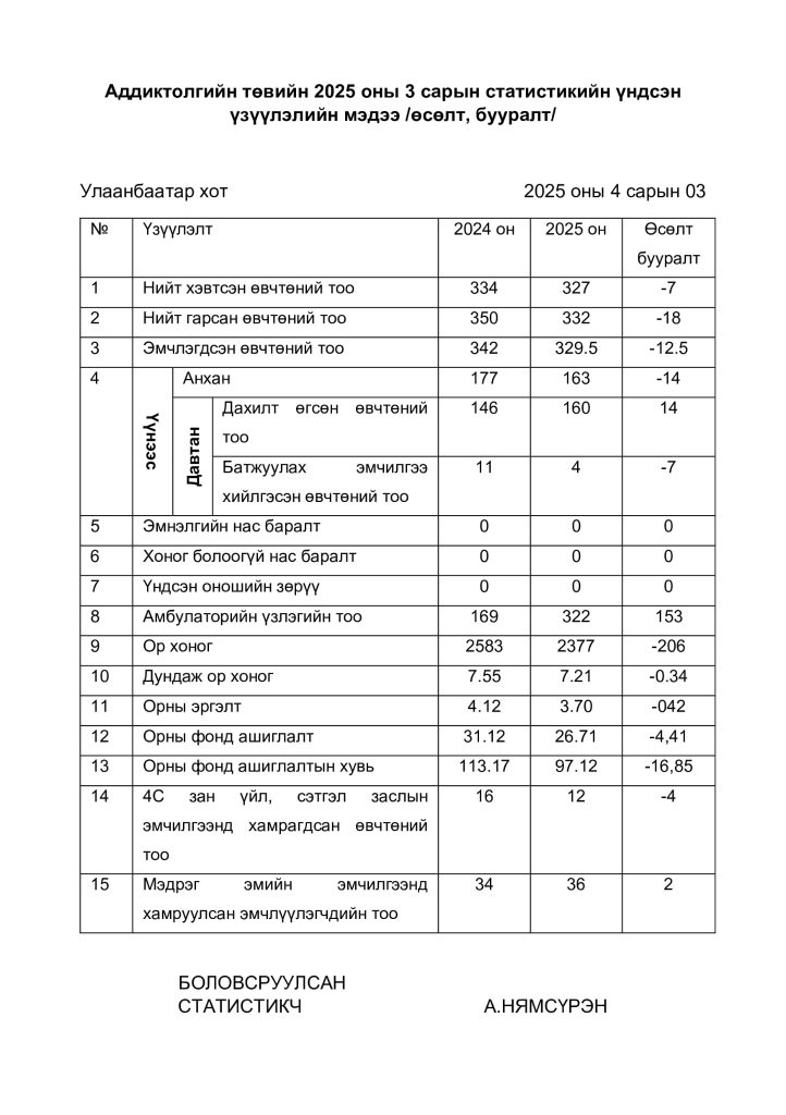 Аддиктологийн төвийн үндсэн үзүүлэлт 3-р сарын мэдээ